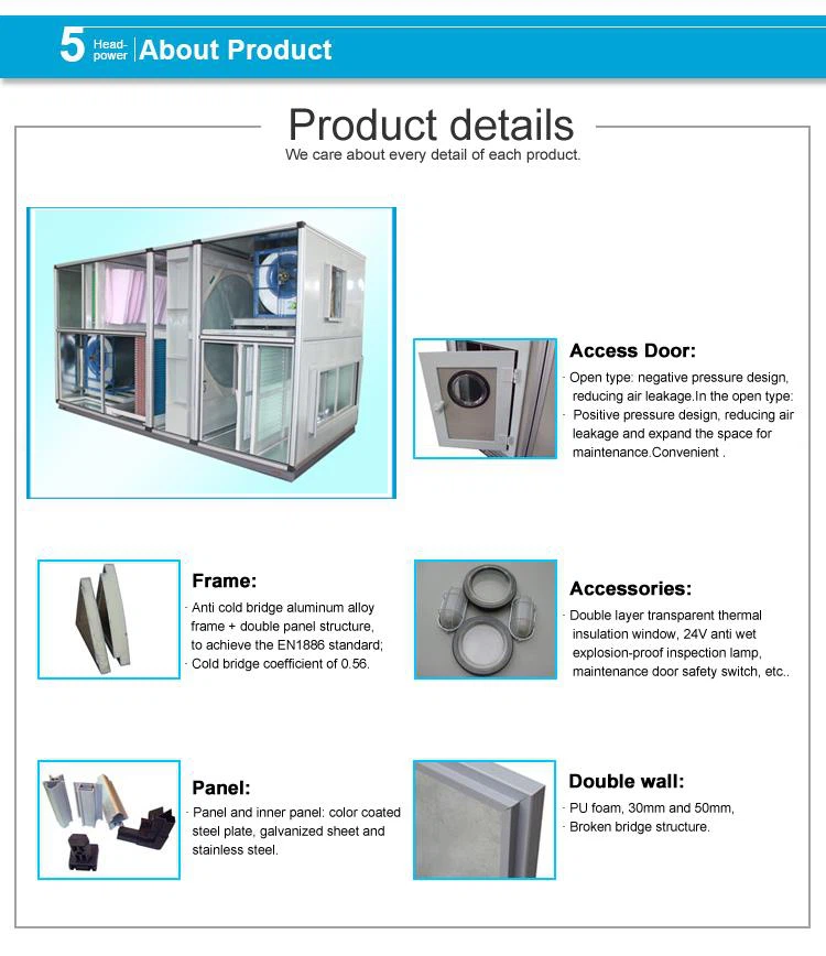 Јединица за руковање ваздухом са повратом топлоте на точковима Увод. Јединица за обраду свежег ваздуха са рекуперацијом топлоте користи филтере великог капацитета, високих перформанси за грубу, средњу и Лаииа високу ефикасност. Има јаку водоотпорност, велику чврстоћу и није лако поквасити.